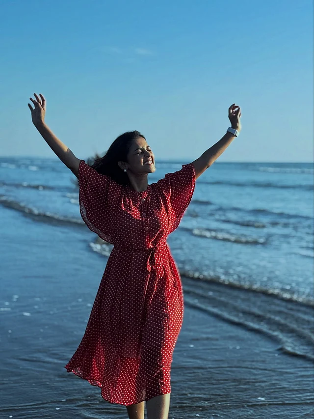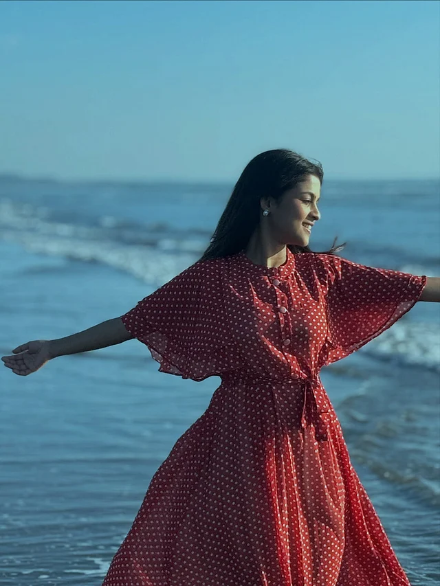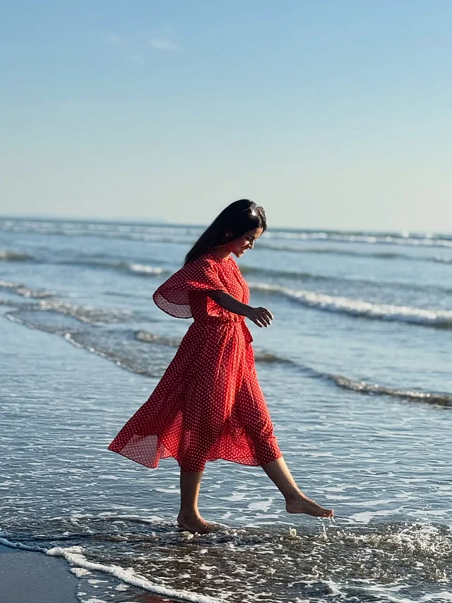 ফ্লোই, হাঁটু-দৈর্ঘ্যের এই পোশাক সমুদ্রের বাতাসে উড়ছে যেন। কোমরে বাঁধা বেল্ট ডিটেইল লুকটিকে আরও স্ট্রাকচার্ড করে তুলেছে, আবার রাফলড স্লিভ এনেছে নাটকীয়তা।