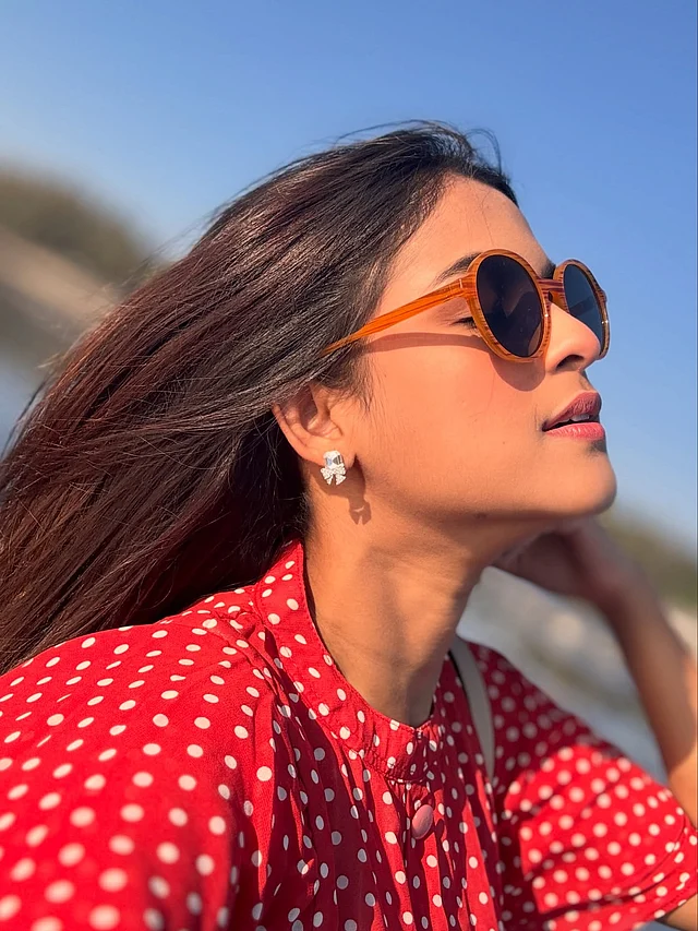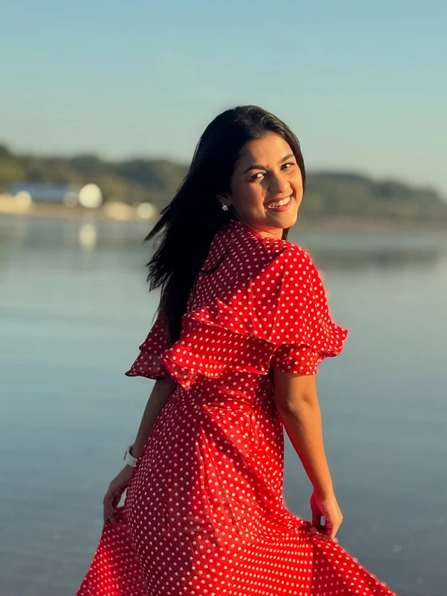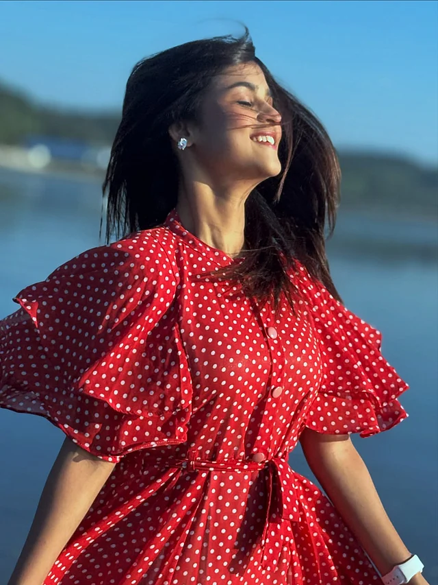 ভ্রমণের এই মুহূর্তে তাঁর লুকটি একেবারেই সহজ আর প্রাণবন্ত—যেন ছুটির দিনের হালকা আনন্দ গায়ে মেখে নেওয়া। লাল রঙের সাদা পোলকা ডটের মিডি ড্রেসটি তাঁর পুরো লুকের কেন্দ্রবিন্দু।