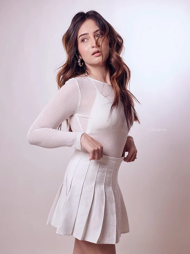 এই লুকের মূল আকর্ষণ তাঁর মোনোক্রোম আউটফিট। উপরের অংশে শ্রীমা পরেছেন একটি শিয়ার রিবড, বডি-ফিটেড ফুল-স্লিভ সাদা টপ। এর সঙ্গে জুটি হয়েছে হাই-ওয়েস্টেড প্লিটেড মিনি স্কার্ট।