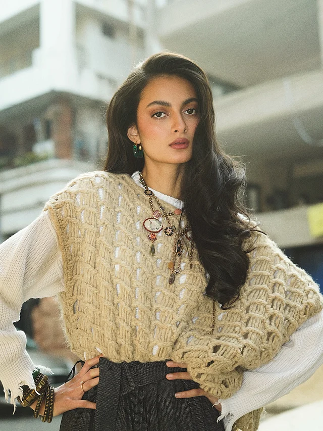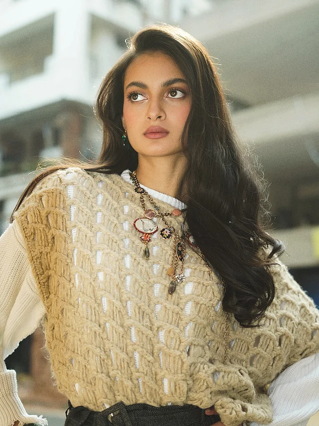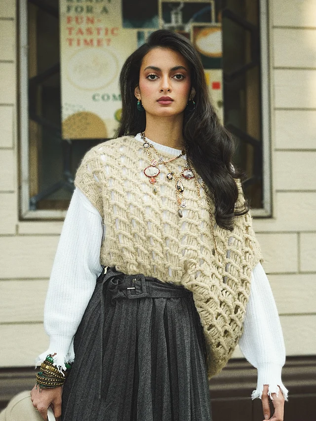 সারার সাম্প্রতিক লুকের মূল আকর্ষণ ছিল ক্রিম শেডের নিটেড স্লিভলেস ভেস্ট। ভেতরে পরা সাদা ফুল স্লিভ টপ পুরো লুকটাকে রেখেছে ফ্রেশ আর সফট। বটমে হাই-ওয়েস্ট চারকোল গ্রে প্লিটেড স্কার্ট, কোমরে বেল্ট ডিটেইল—যা লুকে এনেছে ফিমিনিন ছোঁয়ার সঙ্গে পাওয়ার ড্রেসিং ভাইব।