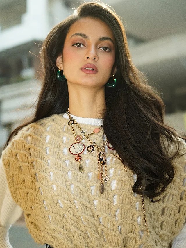 জুয়েলারিতেও ছিল স্টেটমেন্টের ছাপ। গলায় গোল্ড টোনের মাল্টিলেয়ার্ড ভিন্টেজ—ইনস্পায়ার্ড চেইন নেকলেস, কানে ডার্ক গ্রিন স্টোনের স্টাড ইয়াররিং, আর এক হাতে একাধিক ব্যাঙ্গল—সব মিলিয়ে লুকটা হয়ে উঠেছে এলিগ্যান্ট আর নজরকাড়া।