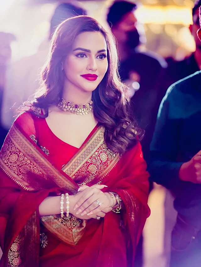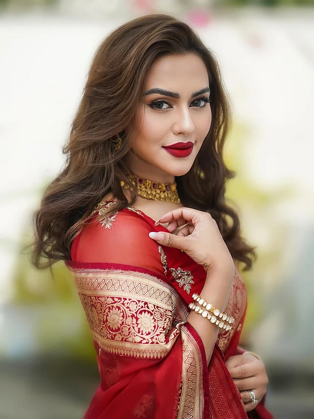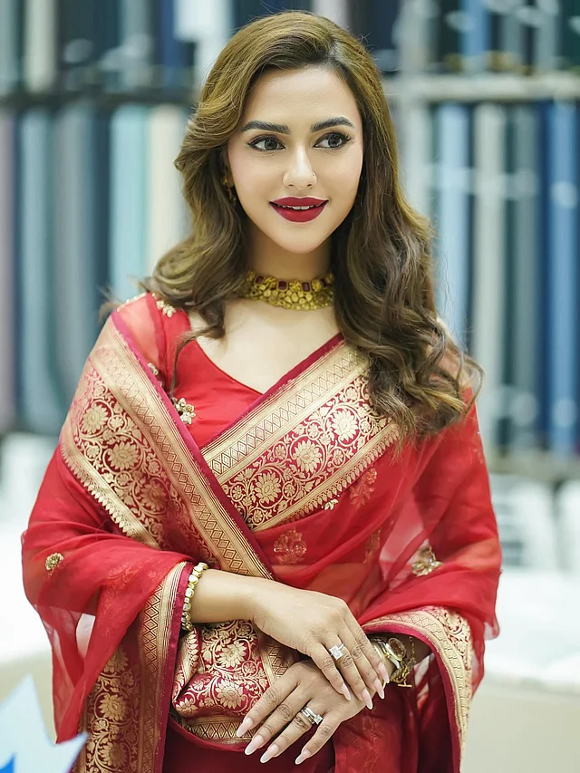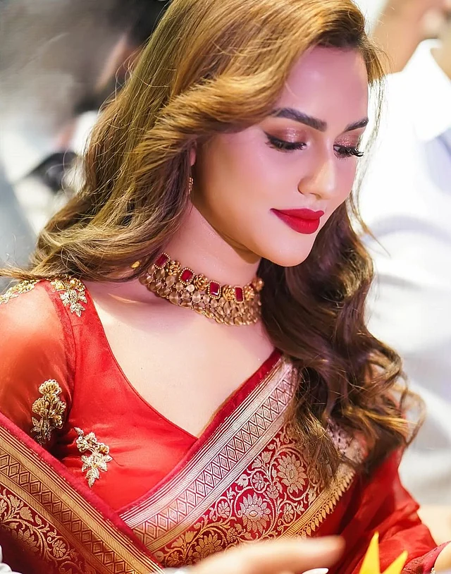 লাল রং যে কতটা তীব্র, আকর্ষণীয় এবং রাজকীয় হতে পারে, নুসরাত ফারিয়ার এই লুক তারই প্রমাণ। রক্তিম আভার এই লুকে গ্ল্যাম ছড়াচ্ছেন অভিনেত্রী। তাঁর পরনে ডিজাইনার সাফিয়া সাথীর সিঁদুরলাল শাড়ি, যার জমিনজুড়ে সোনালি জরি ও সিকুইনের সূক্ষ্ম ফ্লোরাল কারুকাজ।