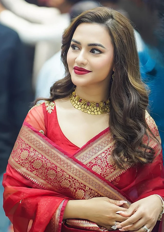 তবে এই সাজের মূল আকর্ষণ নিঃসন্দেহে রেড লিপ লুক—ঠোঁটে গাঢ় লাল লিপস্টিক দিয়েছেন শাড়ির সঙ্গে মিল রেখে। চুলে করেছেন সফট কার্ল। সব মিলিয়ে লাল শাড়ির সমকালীন গ্ল্যামারের ছোঁয়ায় অন্য রকম সুন্দর লাগছে নুসরাত ফারিয়াকে।