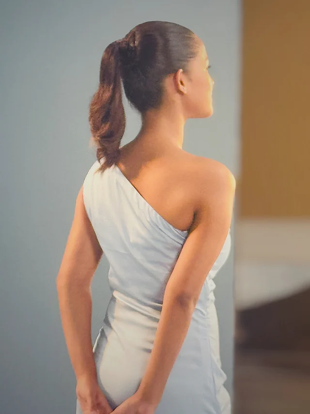 গয়নায় নেই কোনো ভারিক্কি , শুধুমাত্র সাদা পাথরের ছোট স্টাড পরেছেন সুন্দরী । আর চুল পেছনে টেনে স্লিক পনিটেল করা হয়েছে, যা লুকটিকে দিয়েছে এলিগ্যান্ট ফিনিশ।