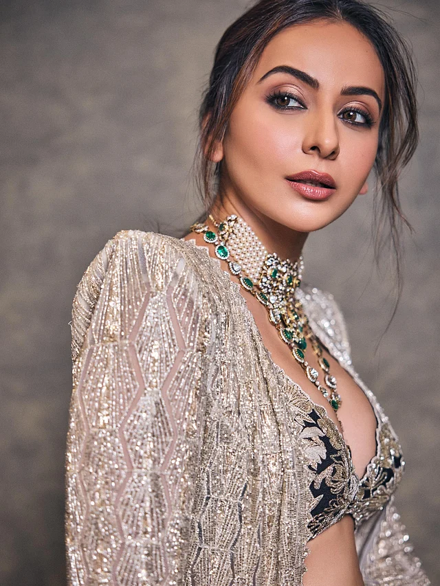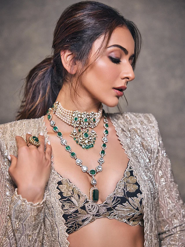 গয়নার ক্ষেত্রেও রাকুল প্রীত সিং বেছে নিয়েছেন স্টেটমেন্ট স্টাইল। পান্না রঙের পাথর আর মুক্তার সংমিশ্রণে তৈরি ভারী চোকার ও লেয়ার্ড নেকলেস লুকটিকে করেছে আরও রাজকীয়। ম্যাচিং রিং ও ব্রেসলেট পুরো স্টাইলিংকে দিয়েছে পরিপূর্ণতা।