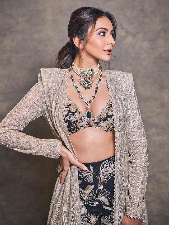 এই সেটের ওপর রাকুল পরেছেন একটি লং, ওপেন-ফ্রন্ট জ্যাকেট। হালকা শিমারি ফেব্রিকে তৈরি এই জ্যাকেটটিতে রয়েছে জ্যামিতিক ও ভার্টিক্যাল টেক্সচার, যা তাঁর গড়নকে আরও লম্বা ও সুঠাম করে তুলেছে।