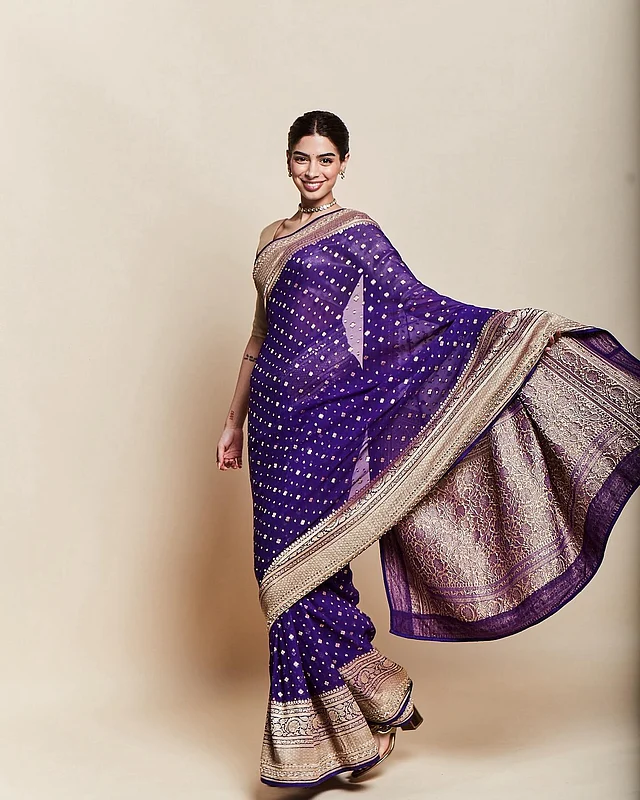 গাঢ় বেগুনি শাড়িতে আভিজাত্যের ছোঁয়া। এই লুকে ভারতীয় ডিজাইনার আনিতা ডোংগরের নকশা করা বেগুনি শাড়িতে দেখা যাচ্ছে তাঁকে। শাড়িটির আঁচল ও পাড়জুড়ে সোনালি জরির কাতান শাড়ির নকশা। শাড়িটির রয়েছে সোনালি বুটিদার জমিন। একেবারেই মিনিমাল মেকআপ, গ্লসি গোলাপি ঠোঁট ও স্লিক খোঁপায় সাজ রেখেছেন অতি সাধারণ। গলায় পলকি বসানো সিম্পল চোকার ও কানের পলকি দুলে মায়া কাড়ছেন তিনি।