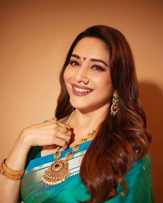 লুজ কার্ল করা চুল, মিনিমাল মেকআপ ও মহারাষ্ট্রীয় গয়নায় মাধুরীকে দেখতে লাগছে মোহময়ী।