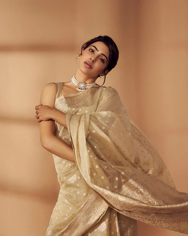 দক্ষিণের লাস্যময়ী অভিনেত্রী সামান্থা রুথ প্রভুর মতো আপনিও চাইলে ট্রেন্ডি আইভরি রঙের একটি শাড়ি বেছে নিতে পারেন এই ঈদে। যাতে সোনালি রঙে কাতান শাড়ির নকশা করা থাকলেও ক্ষতি নেই। অভিনেত্রী এর সঙ্গে বেছে নিয়েছেন সোনালি রঙের স্লিভলেস ব্লাউজ। ট্রেন্ডি মুক্তার চোকার ও ন্যুড ফিনিশের মেকআপ এই আউটফিটের সঙ্গে ভালো লাগবে। বলাই বাহুল্য, বিয়ের পোশাকেও আইভরি রং এখন ট্রেন্ডের শীর্ষে।