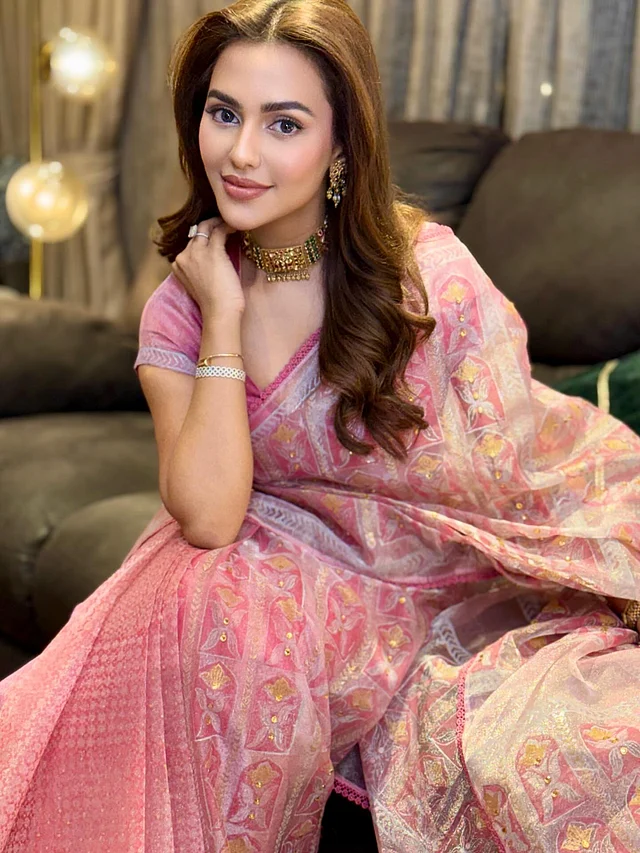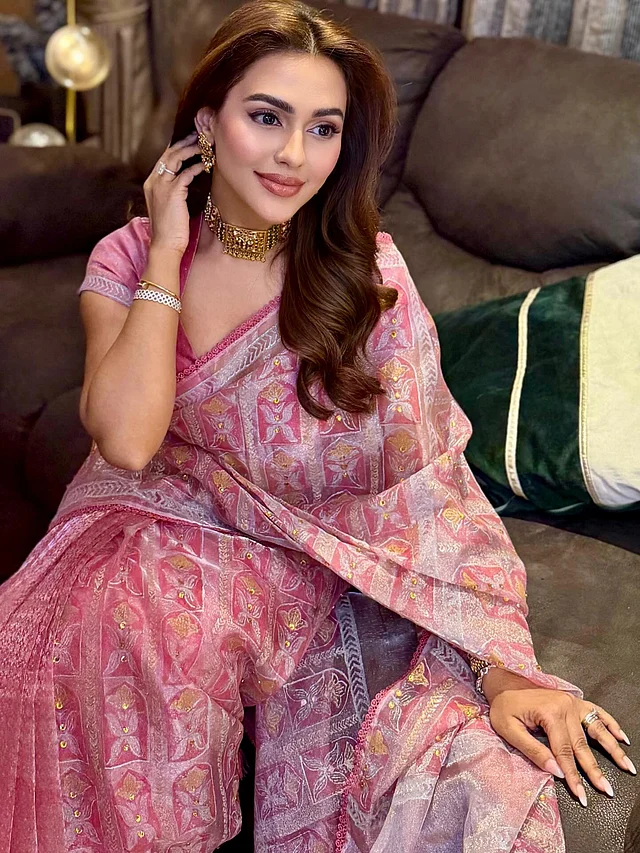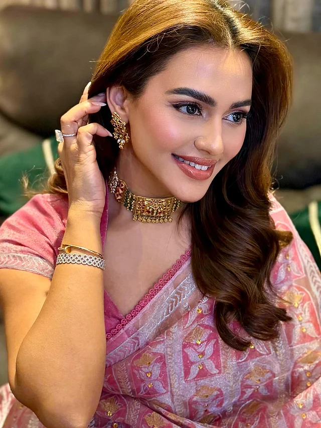 এই লুকে নুসরাত ফারিয়া ধরা দিয়েছেন গোলাপি শাড়িতে , যা উৎসবের আবহকে আরও উজ্জ্বল করে তুলেছে। শাড়িটির জমিন জুড়ে রয়েছে ফ্লোরাল মোটিফ ও নকশা, যেখানে গোল্ডেন ডিটেইলিং লুকটিকে দিয়েছে রাজকীয় আবেদন। এর সঙ্গে মানানসই গোলাপি ব্লাউজ পুরো সাজকে করেছে আরও সুন্দর।