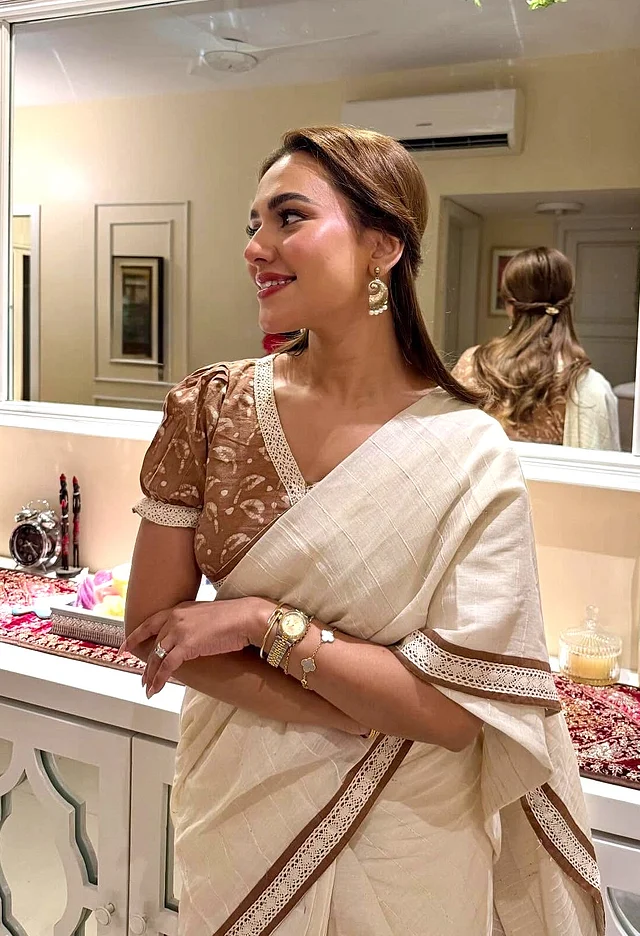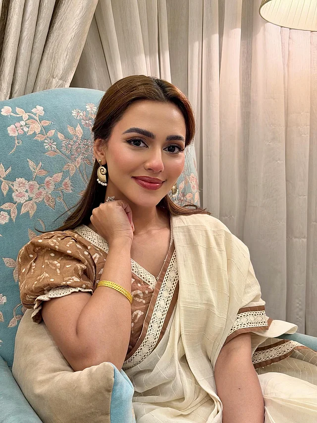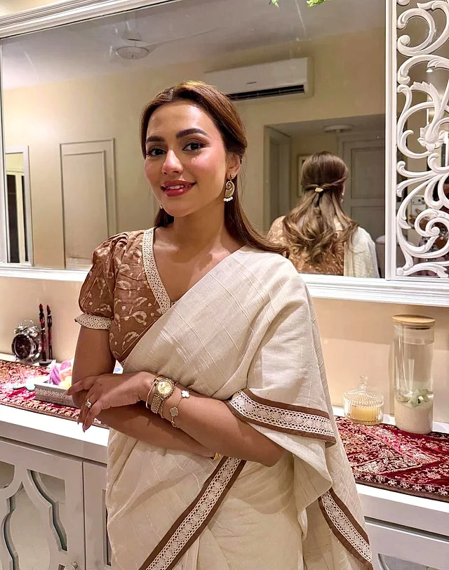 এই লুকে নুসরাত ফারিয়া বেছে নিয়েছেন অফ-হোয়াইট রঙের একটি স্নিগ্ধ শাড়ি, যার বর্ডারে রয়েছে কুশিকাটার লেইসের কাজ। সঙ্গে তিনি পরেছেন বাদামি রঙের ন্যাচারাল ডাই ব্লাউজ। পাফ স্লিভ ডিজাইন লুকটিতে এনেছে ভিনটেজ ছোঁয়া। গয়নার ক্ষেত্রে রেখেছেন মিনিমাল আমেজ । কানে শোভা পাচ্ছে মেটালের শঙ্খ দুল, নিচে ঝুলছে মুক্তা। হালকা ও আরামদায়ক এই দুলগুলো সহজেই মানিয়ে যায় শাড়ি, সালোয়ার কামিজ বা আধুনিক ওয়েস্টার্ন লুকের সঙ্গে।