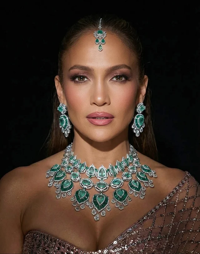 হলিউড তারকা জেনিফার লোপেজ শুধু তার উপস্থিতিই জানান দিলেন না, তিনি যেন পুরো বিয়ের আবহকে আরও উঁচুতে তুলে ধরলেন। মনীশ মালহোত্রার বিশেষভাবে তৈরি রোজ-গোল্ড কাটওয়ার্ক শাড়িতে তার লুক ছিল নিখুঁত এক ফিউশন। যেন বলিউডের ঐশ্বর্য আর হলিউডের সমকালীন গ্ল্যামারের মেলবন্ধন।