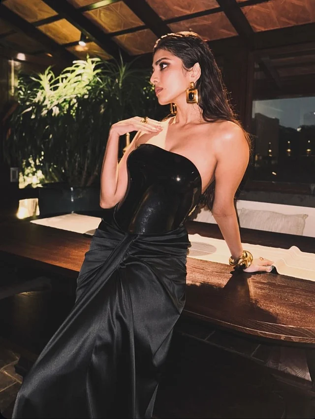 মালাভিকা মোহনন বেছে নিয়েছিলেন গ্লসি ব্ল্যাক করসেট ও স্যাটিন স্কার্ট, মিশো-র কাস্টম সংগ্রহ থেকে। রিজিড করসেটের সঙ্গে ফ্লুইড ড্রেপ—এই টেক্সচারের বৈপরীত্য কালোকে করেছে গতিশীল।