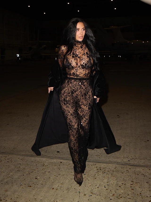 প্যারিসে কিম কারদাশিয়ান-এর শিয়ার ব্ল্যাক লেস লুক ছিল সাহসী ও আত্মবিশ্বাসী। বালেনসিয়াগা টার্টলনেক লেয়ারিং এবং স্কিমস-এর ব্রালেট, পুরো মনোক্রোম লুকে যোগ করেছে আধুনিক গ্ল্যাম।