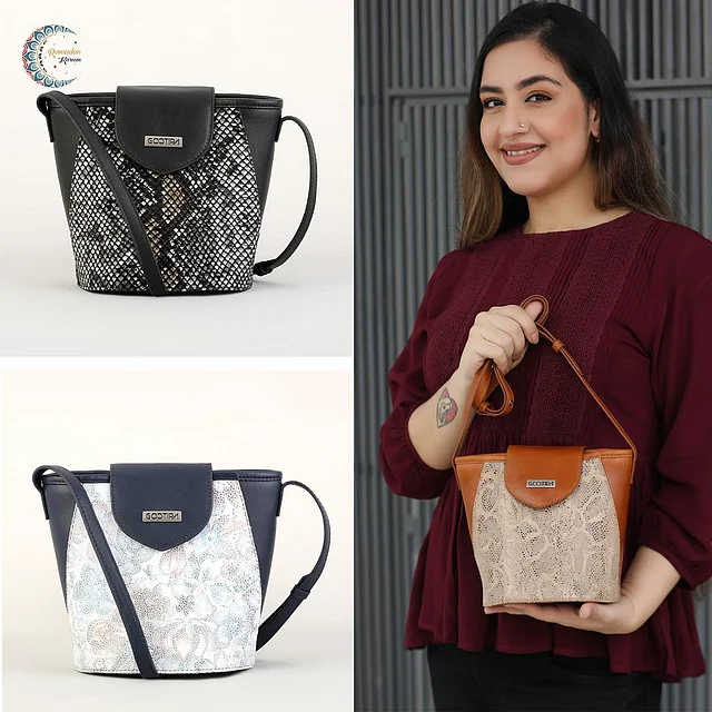 স্টাইলিশ এই ব্যাগে নানা রঙের পাথর বসানো সোনালি সরু লেসটি একেবারে ফেস্টিভ লুক দিচ্ছে। এটির ভেতরে ওয়াটারপ্রুফ লেয়ার আছে।