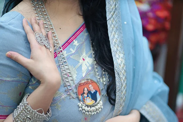 এই ব্রাইডাল সেটটির ডিজাইনের চেয়েও থিমটি বেশি স্পেশাল। কাজটি একটু চ্যালেঞ্জিং ছিল। রেজিন নিয়ে টেকসই কাজ করা সহজ নয়। এখানে যিনি কনে, তিনি চেয়েছিলেন, বিয়ের গয়নায় মা-বাবার ছবি ব্যবহার করা হোক।