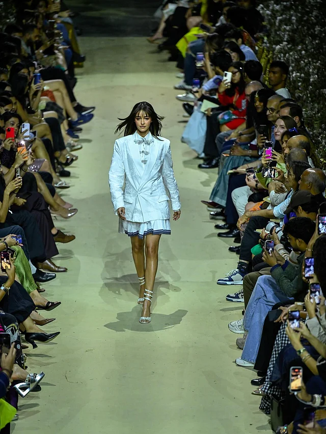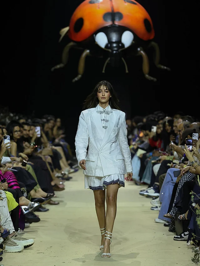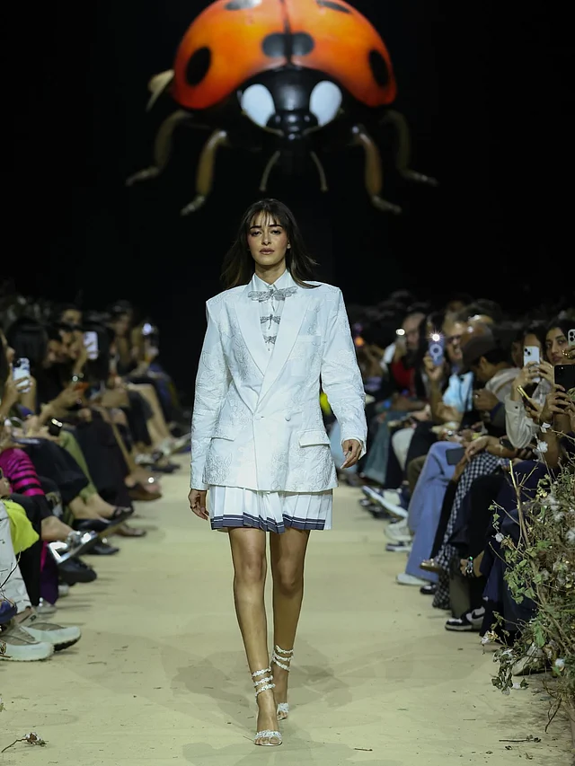শোতে অনন্যা পরেছিলেন রাহুল মিশ্রার ফল/উইন্টার ২০২৬ কালেকশনের একটি স্টেটমেন্ট লুক। রিল্যাক্সড ফিট ও স্ট্রাকচারড কলারের সাদা শার্টের উপর তিনটি ক্রিস্টাল-স্টাডেড ড্রাগনফ্লাই ব্রোচ লুকটির প্রধান আকর্ষণ। সঙ্গে প্লিটেড টেনিস স্কার্ট পড়েছেন , যার ইন্ডিগো বর্ডার পুরো আউটফিটে কনট্রাস্ট তৈরি করেছে। এর ওপর টোন-অন-টোন ফ্লোরাল এমব্রয়ডারিতে সজ্জিত আইভরি ব্লেজার লেয়ারিং স্টাইলকে দিয়েছে এক অনন্য মাত্রা।