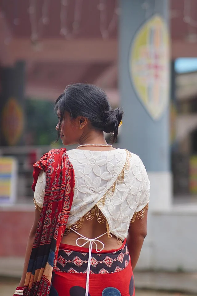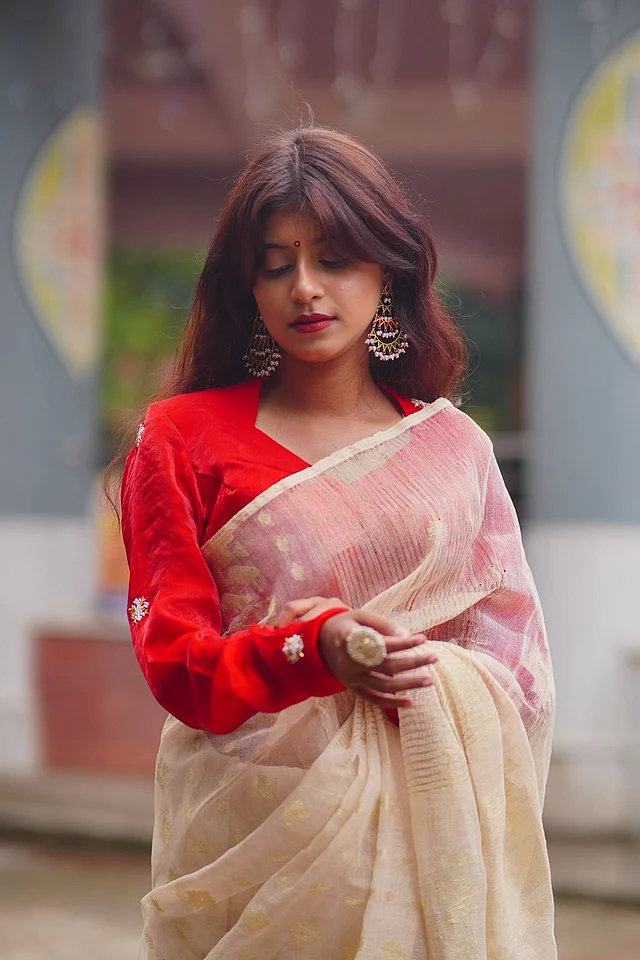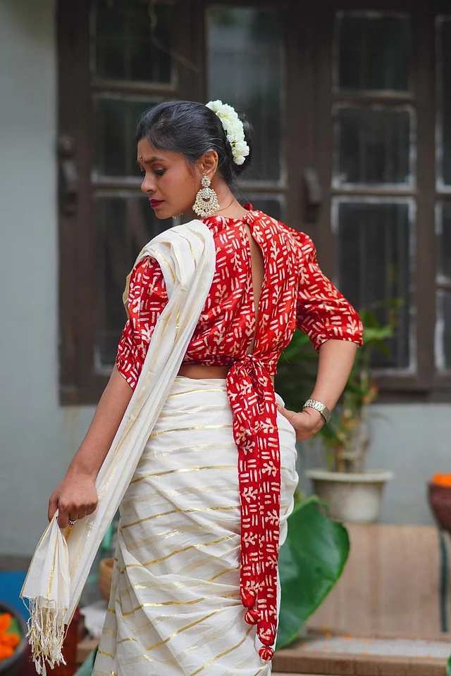 পূজায় আরেকটা গুরুত্বপূর্ণ রং লাল। সিল্ক ফেব্রিকে করা হয়েছে ব্লাউজটি। ব্লাউজটির সবচেয়ে নজরকাড়া বিশেষত্ব হলো ওপেন ব্যাক ডিজাইন। লং স্লিটের সঙ্গে কোমরের নিচের অংশে একই নকশার কাপড় দিয়ে ঝোলানো টাই। পাফি স্লিভ ব্লাউজটিকে আরও স্টাইলিশ করেছে।