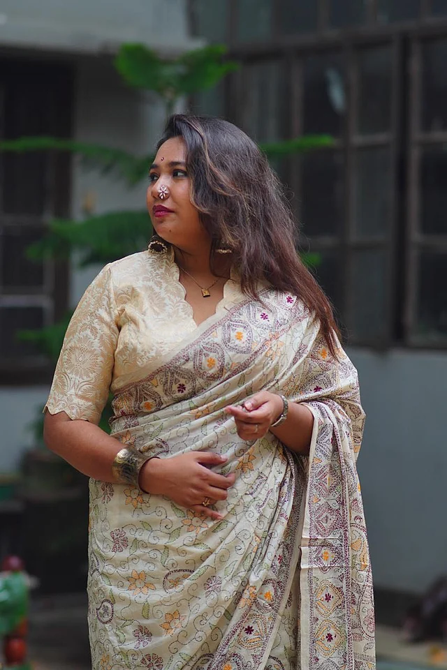 কাতান কাপড়ে তৈরি এই ব্লাউজ। দেখতে ট্র্যাডিশনাল এই ব্লাউজটির ডিপ নেকলাইন পরিধানকারীর লুকে দিবে বোল্ডনেস। মানিয়ে যাবে পূজার যেকোনো সাজের সঙ্গেই।