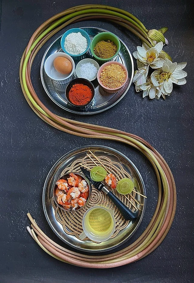 সব উপকরণ আধা কাপ পানিতে ভালোভাবে মিশিয়ে ফেটিয়ে নিতে হবে। শাপলা ডাঁটা ছিলে ফুটন্ত পানিতে লবণ দিয়ে ২-৩ মিনিট সেদ্ধ করে নিতে হবে। এবার ডাঁটা গোল করে পেঁচিয়ে কাঠিতে গেঁথে ললিপপের মতো বানিয়ে নিতে হবে।