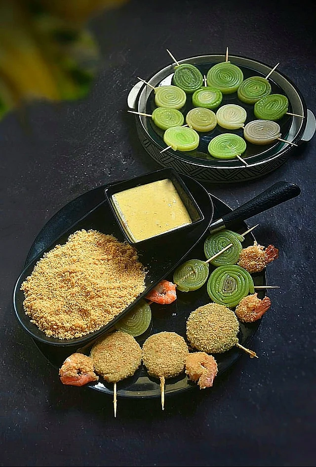 এবার ললিপপগুলো গোলায় চুবিয়ে বিস্কুটের গুঁড়ায় গড়িয়ে নিন। মধ্যম আঁচে ডুবোতেলে ভেজে নিন। ইচ্ছা করলে গাঁথার সময় ডিম আর বিস্কুটের গুঁড়ায় গড়ানো চিংড়ি দেওয়া যায় সাসলিকের মতো।
