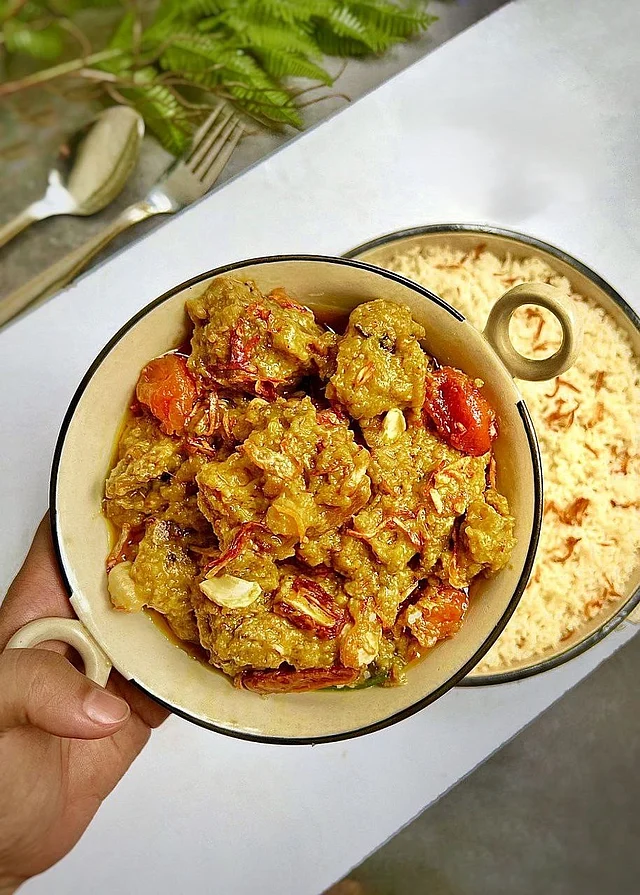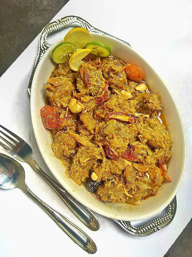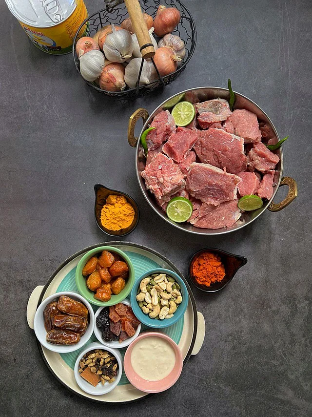 এবার টক দই, বাটা কাঁচামরিচ আর স্বাদমতো লবণ ও চিনি দিয়ে নেড়ে ১৫ মিনিট মৃদু আঁচে ঢেকে রান্না করুন। এরপর বেরেশতা, কিসমিস, খেজুর, আলুবোখারা দিয়ে ঢেকে মৃদু আঁচে আরো ১০ মিনিট রান্না করুন। ওপরে তেল ভেসে উঠলে নামিয়ে পছন্দমতো সাজিয়ে পরিবেশন করুন ড্রাই ফ্রুটস দিয়ে বিফ কোরমা।