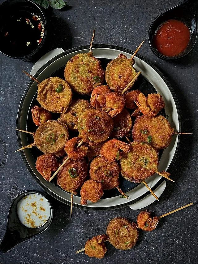 এবার ললিপপগুলো গোলায় চুবিয়ে বিস্কুটের গুঁড়ায় গড়িয়ে নিন। মধ্যম আঁচে ডুবোতেলে ভেজে নিন। ইচ্ছা করলে গাঁথার সময় ডিম আর বিস্কুটের গুঁড়ায় গড়ানো চিংড়ি দেওয়া যায় সাসলিকের মতো।