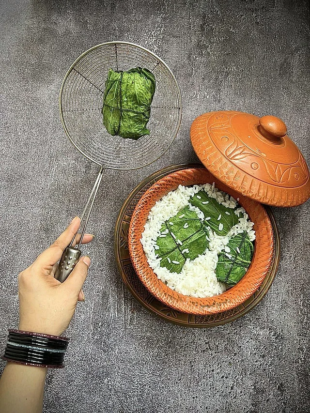 এবার দেড় গুণ ফুটন্ত পানি দিয়ে ভাত বসিয়ে দিন। নিয়মমাফিক ভাত রান্না করে প্রায় হয়ে এলে হাঁড়ির মাঝখান থেকে কিছু ভাত সরিয়ে লাউপাতায় মোড়ানো মাছের টুকরাগুলো রেখে দিন। ওপরে সরিয়ে রাখা ভাত দিয়ে ঢাকনা দিয়ে ঢেকে মৃদু আঁচে রাখুন। ১০ মিনিট এভাবে রেখে দিন। ভাত সরিয়ে মাছগুলো সাবধানে তুলে পাতাসহ পরিবেশন করুন।