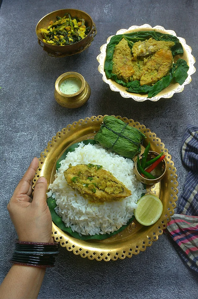 এতে ভাত হয়ে এলে লাউপাতায় মসলামাখানো ইলিশের টুকরা মুড়ে তাতে দিয়ে দেওয়া হয়। ভাত হতে হতে চোখের পলকেই সেই ভাপে রান্না হয়ে যায় ইলিশ। পাতাসহই গরম ভাত আর ইলিশ মাছ পরিবেশন করা হয় পাতে। তাজা ইলিশের সঙ্গে এভাবে পাতা আর শর্ষের ফ্লেভারের মাখা-মাখা মসলায় ভাত মেখে খাওয়ার মজাই আলাদা। আমাদের দেশের গোপালগঞ্জসহ আরও কিছু এলাকায় এভাবে ইলিশ, কই ইত্যাদি মাছ ভাতে দিয়ে রান্না করা হয়। এ জন্য অবশ্য বসা ভাত রান্না করতে হয়, মাড় ঝরানো যায় না।