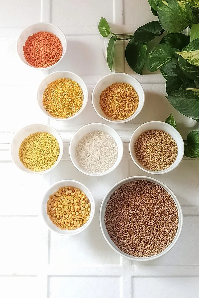 তারপর এক এক করে সব ধরনের ডাল, চাল ও গম শুকনা করে গুঁড়া করে নিতে হবে।