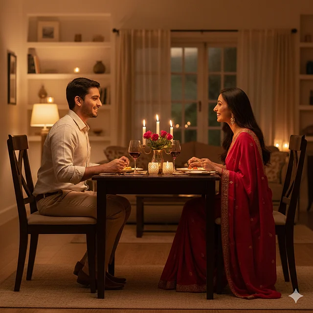 মোমবাতির আলোয় ডিনার। ডাইনিং স্পেস সাজান মোমবাতি বা টুনিবাতি দিয়ে। হালকা গান চলবে। নিজের হাতে রান্না করা খাবার বা প্রিয়জনের প্রিয় খাবার থাকুক সঙ্গে। নিজেও একটু পরিপাটি হয়ে, সেজেগুজে থাকুন।