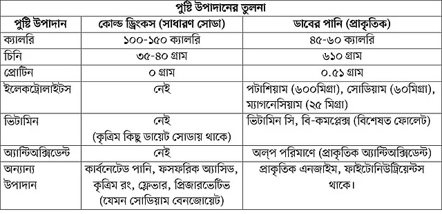 স্বাস্থ্য, পুষ্টিগুণ, পরিবেশগত প্রভাব এবং দীর্ঘমেয়াদি সুবিধার দিক থেকে ডাবের পানি অনেক ভালো। এটি প্রাকৃতিক এবং পুষ্টিকর। হাইড্রেশন, হার্টের স্বাস্থ্য এবং কিডনির জন্য উপকারী। পরিবেশবান্ধব (বিশেষ করে প্রাকৃতিক ডাব থেকে)। দীর্ঘ মেয়াদে স্বাস্থ্য খরচ কমায়। আর কোল্ড ড্রিংকস শুধু তাৎক্ষণিক স্বাদ ও সামাজিক আকর্ষণ দেয়, কিন্তু এর স্বাস্থ্যঝুঁকি (ডায়াবেটিস, ওবেসিটি, দাঁতের ক্ষতি) এবং পরিবেশগত ক্ষতি এটিকে কম পছন্দনীয় করা সবার জন্য ভালো।