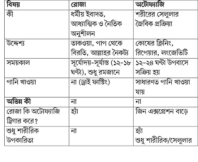 যার কারণে রোজা রাখায় আমাদের অটোফ্যাজি কাজ করলেও রোজা অটোফ্যাজি নয়। তাই বিষয়টি মানুষ যাতে ভুল না বোঝে, সেটা খেয়াল রাখতে হবে।